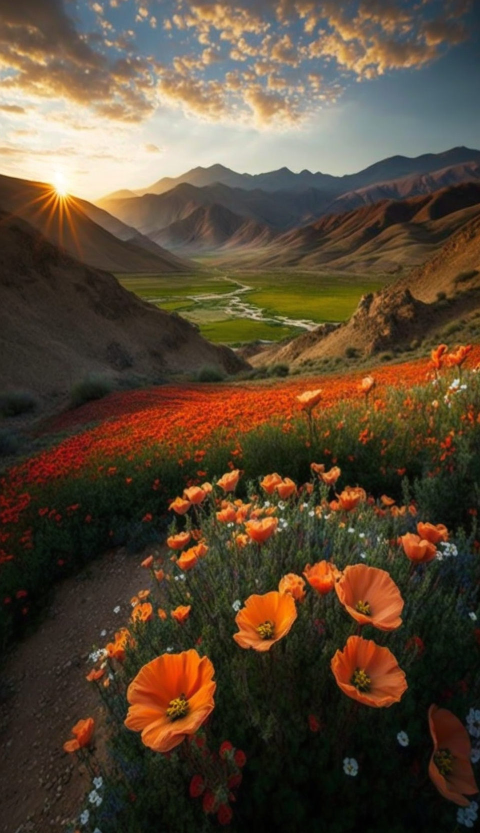 Immerse yourself in a valley surrounded by steep mountain ranges, with a gentle hill full of poppies in the foreground. The sun shines brightly in the sky, illuminating the entire scene. Experience the joy and beauty of this vibrant landscape where wildflowers bloom abundantly. This watercolor painting captures the unspoiled beauty of nature, perfect for your phone case.