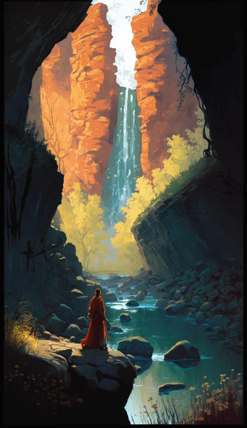 Step into a breathtaking illustration inspired by the styles of Killian Eng, Alexander Dux, Warwick Goble, and Erin Hanson. This low angle perspective captures a forest lagoon at sunrise, with a dramatic waterfall cascading from a tall cliff. The scene features stones, flowering grasses, and atmospheric lighting that adds to its beauty. Carry this awe-inspiring vision on your phone case.