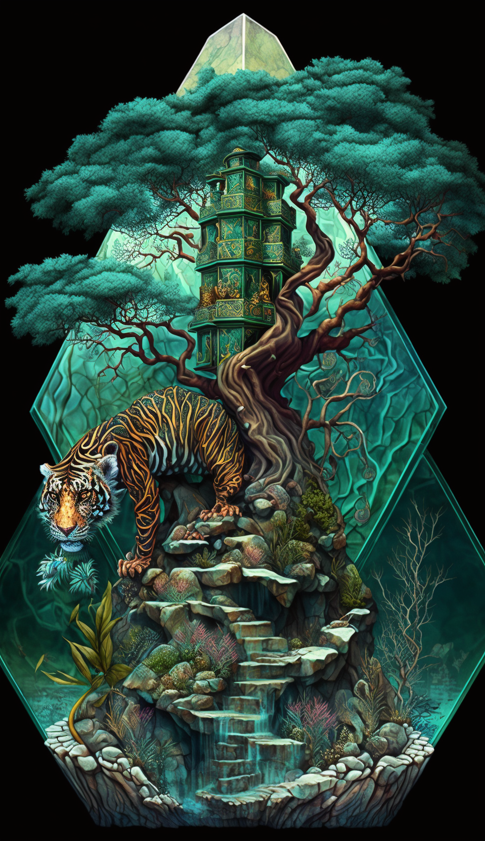 Enter the realm of fantasy with this intricate artwork featuring a dragon hexagon malachite island. The island boasts a stairway to heaven with a tree of life on top, creating a multi-colored and enchanting scene. The intricate details and high resolution bring this captivating world to life.