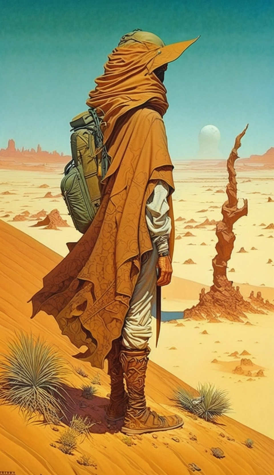 Embark on a journey through the desert with this captivating artwork by Moebius. The desert traveler in a vast and awe-inspiring landscape creates a sense of adventure and exploration. Let the detailed and rich illustration transport you to this imaginative world.