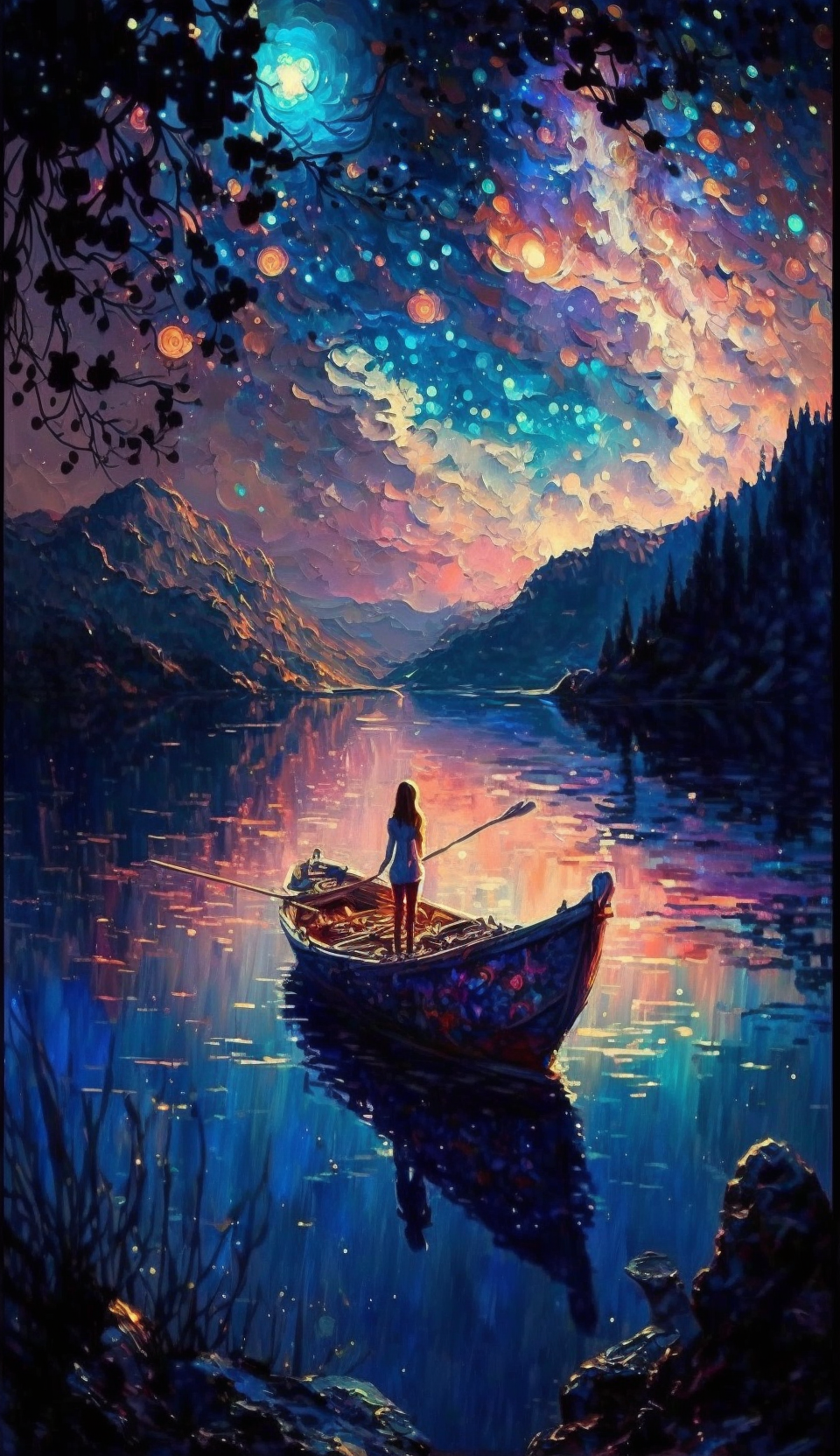 Enter a world of magic and wonder with this breathtaking fantasy landscape. Stars reflect in water, creating a stunning visual spectacle. This oil painting with palette knife texture is inspired by the styles of Vincent Van Gogh, James R. Eads, and Makoto Shinkai. Let the vibrant colors and artistic mastery captivate your imagination.