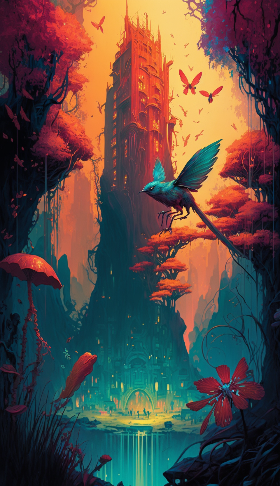 Step into a vibrant and massive bioMecha garden with water flowing from the top. Towers overlook a bustling metropolis below. This fantastical scene is brought to life with Erin Hanson, Jean-Baptiste Monge, and Frazetta's design influence. Expect vibrant saturated contrasts and a visual feast that will transport you to a mesmerizing world.