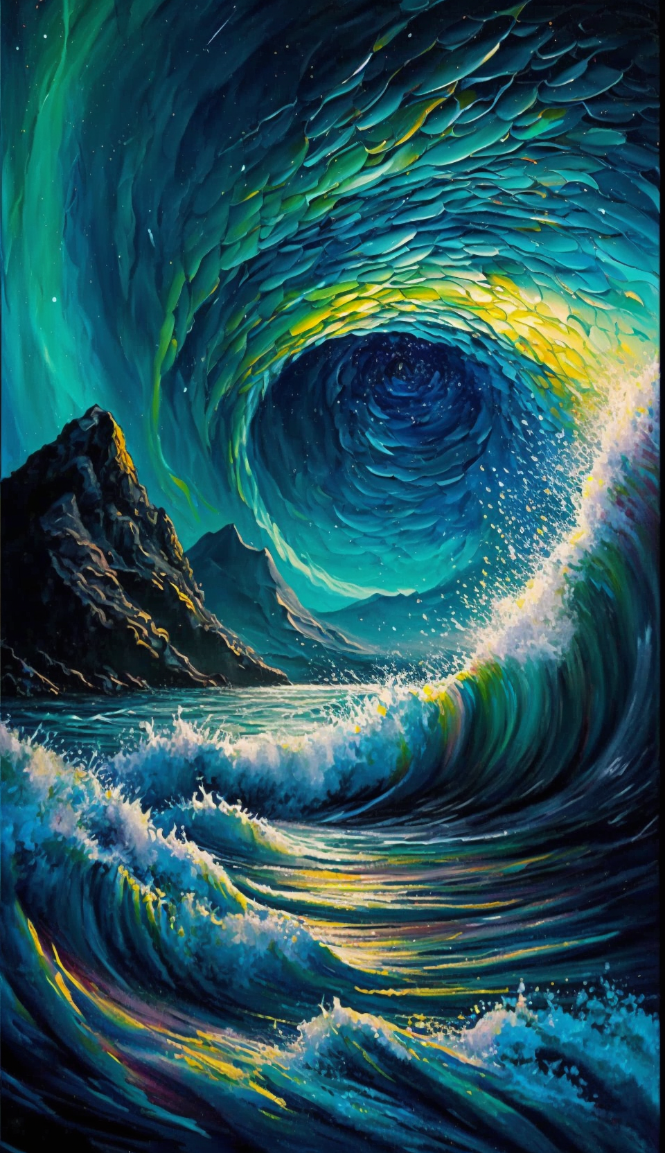 Be enchanted by a mystical arctic fantasy landscape adorned with swirling aurora borealis, stars, and vibrant colors. This oil painting-style artwork, influenced by Iris Scott, Leonid Afremov, and Vincent van Gogh, creates a mesmerizing visual experience. Immerse yourself in the wonder of nature's artistry, where vivid colors and texture intertwine.
