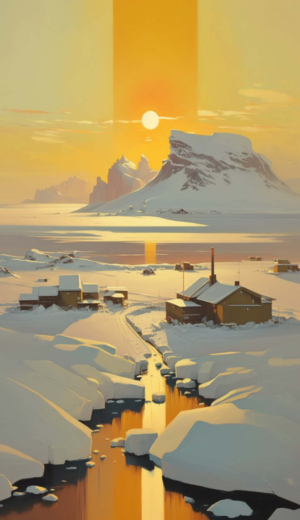 Journey to a glacial tundra town where an oasis stands out amidst the icy landscape. As the sun sets, the snow-covered structures emit a warm glow. This stunning scene, inspired by Raimonds Staprans, transports you to a unique and charming world where nature and civilization coexist in perfect harmony.