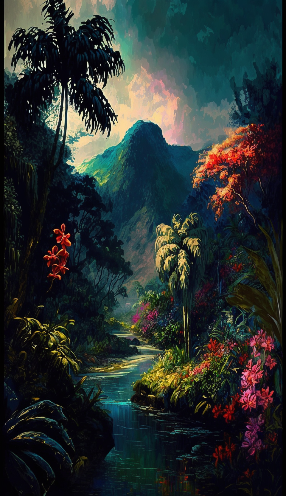 Experience the vibrant and exciting tropicalpunk landscape through the artistic lens of renowned painters. This artwork combines the influences of multiple artists, bringing together a unique and captivating scene.
