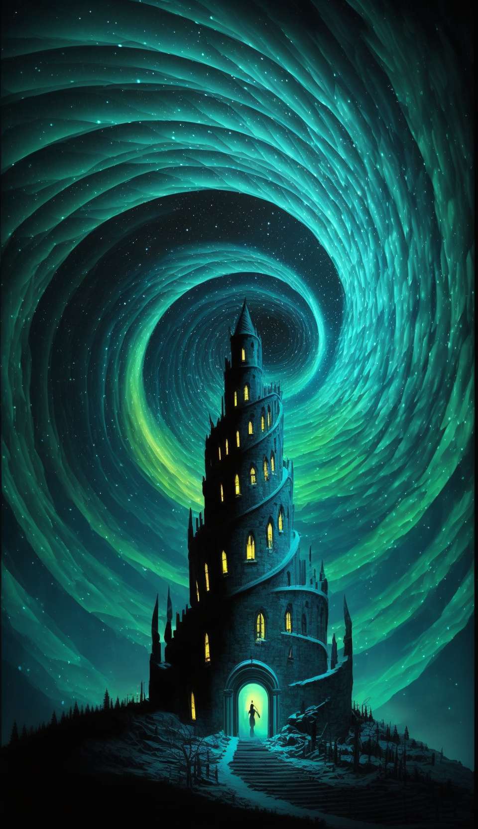 Behold the grandeur of a tall spiraling citadel reaching into the aurora borealis of the night sky. This artwork creates a captivating contrast between architectural wonder and natural cosmic beauty.