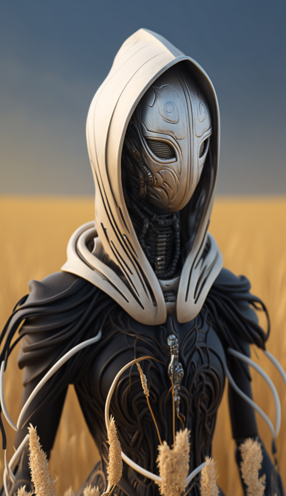 Delve into the realms of imagination with a detailed porcelain female android lost on the vantablack nightmare plains. The mysterious atmosphere of plagued wheat and drifting fog creates a captivating juxtaposition against the android's intricate form.