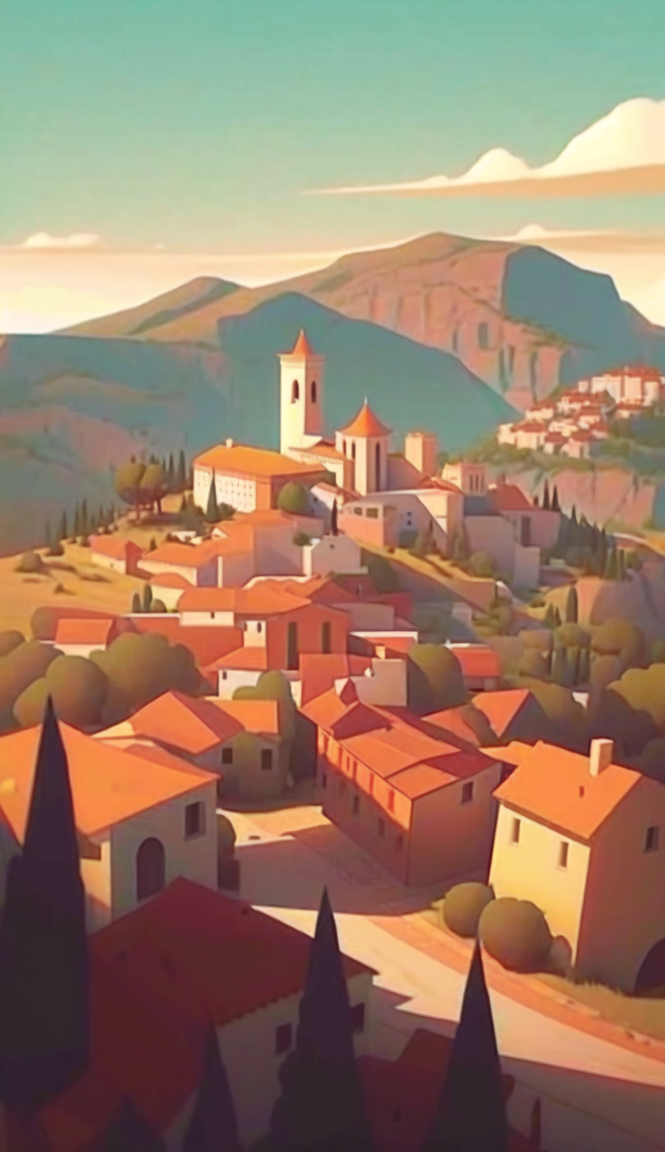 Embark on a journey to a medieval Spanish village set against vast plains. This landscape artwork channels the styles of Atey Ghailan and Joelle Jones, capturing the essence of history and culture.