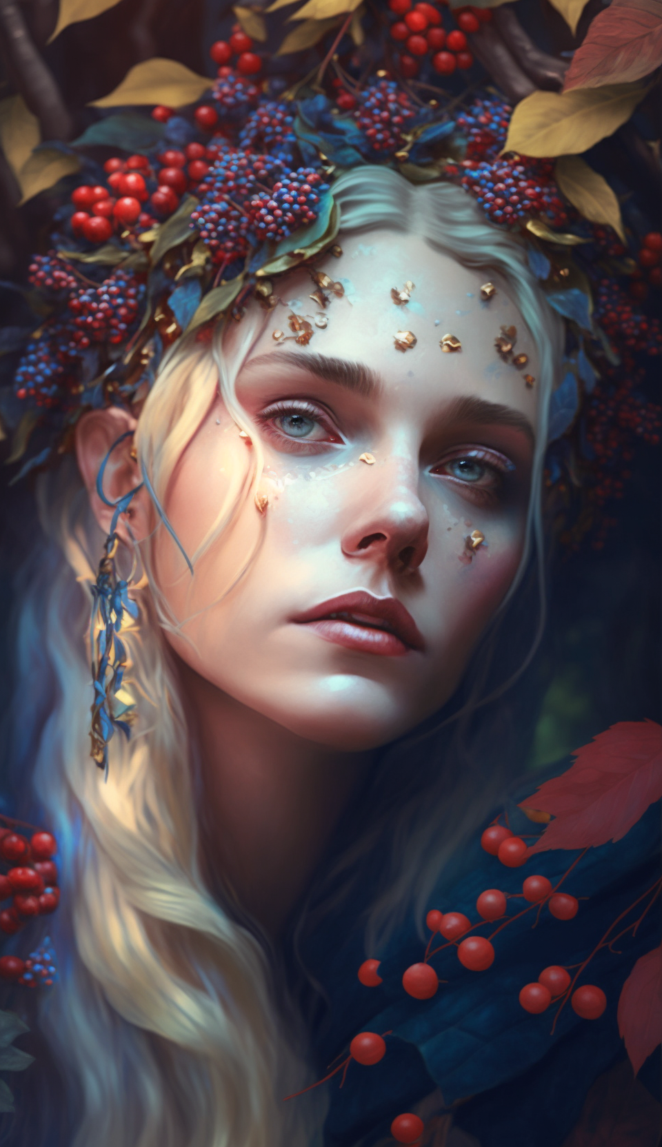 Step into the realm of enchantment with the Enchanted Elven Queen. This close-up portrait captures her joy amidst a magical forest filled with luminescent berries and delectable pie fillings. Influenced by Warwick Goble and Giovanni Battista Tiepolo, this hyper-detailed artwork invokes a sense of wonder and beauty.