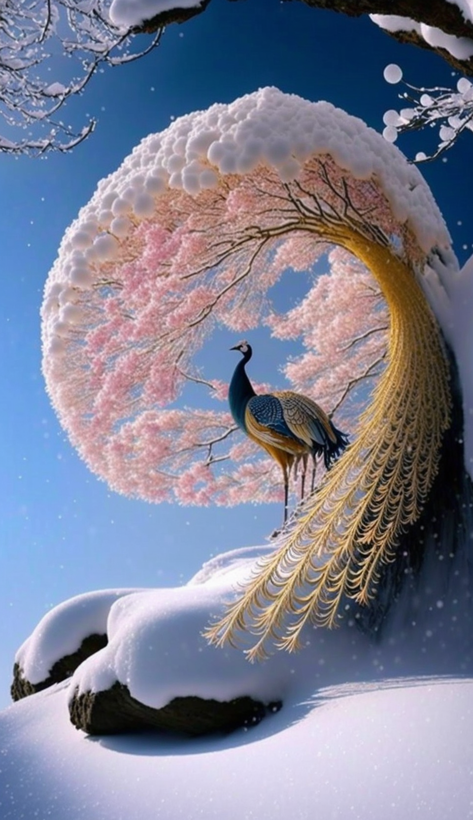 Witness the enchanting 'Phoenix Beneath Cherry Blossoms' where a magnificent golden phoenix unveils its tail feathers like a radiant feather fan under the pink rime tree. The gem embellishments in blue and yellow are lifelike, set against a backdrop of white earth and thick snow, creating a dreamy fairy tale world. Experience the 3D photography effects that bring this scene to life. Adorn your space with this breathtaking artwork.